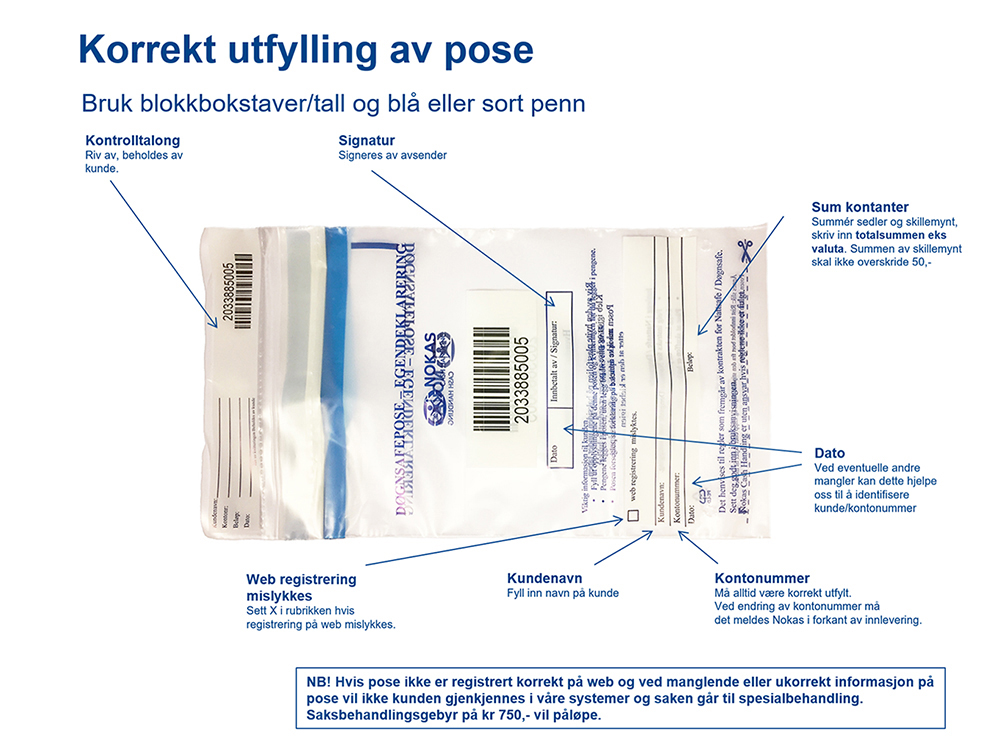 Korrekt utfylling av poser og bilag Nedenfor ser du hvordan du gjør en korrekt utfylling av våre poser og bilag. Klikk på det aktuelle bildet og deretter høyreklikk om du ønsker å skrive ut.