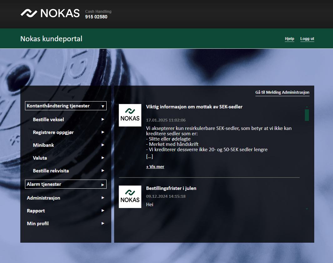 Som kunde av Nokas får du tilgang til vår kundeportal. Her kan du raskt og enkelt utføre din daglig kontanthåndtering.